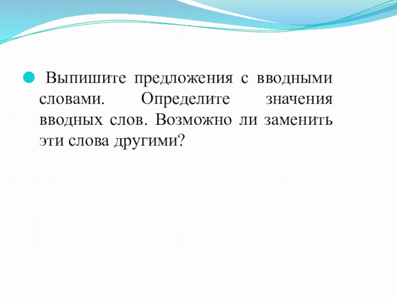 Слайд 19 Выпишите предложения с вводными словами. Определите значения вводных слов. Возможно