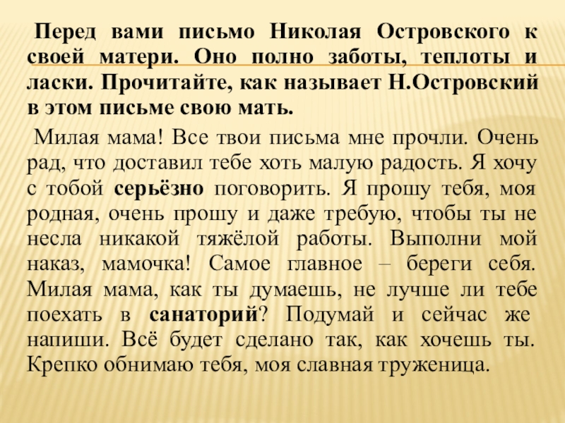 Слайд 13 Перед вами письмо Николая Островского к своей матери. Оно полно заботы,