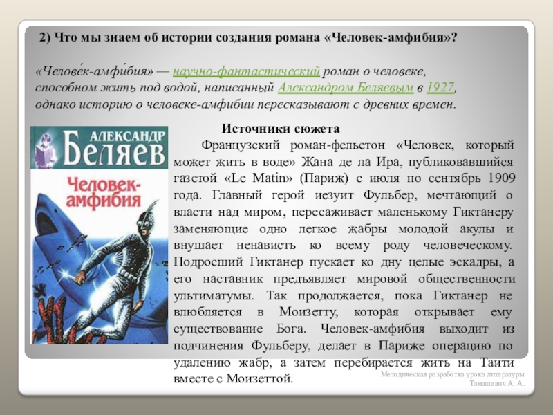 Французский роман-фельетон «Человек, который может жить в воде» Жана де ла Ира, публиковавшийся газетой «Le Matin» (Париж) с июля по сентябрь 1909 года. Главный герой иезуит Фульбер, мечтающий о власти над миром, пересаживает маленькому Гиктанеру заменяющие одно легкое жабры молодой акулы и внушает ненависть ко всему роду человеческому. Подросший Гиктанер пускает ко дну целые эскадры, а его наставник предъявляет мировой общественности ультиматумы. Так продолжается, пока Гиктанер не влюбляется в Моизетту, которая открывает ему существование Бога. Человек-амфибия выходит из подчинения Фульберу, делает в Париже операцию по удалению жабр, а затем перебирается жить на Таити вместе с Моизеттой.
