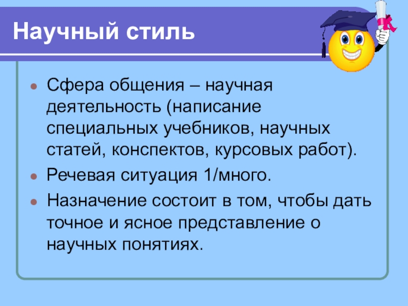 Сфера общения – научная деятельность (написание специальных учебников, научных статей,