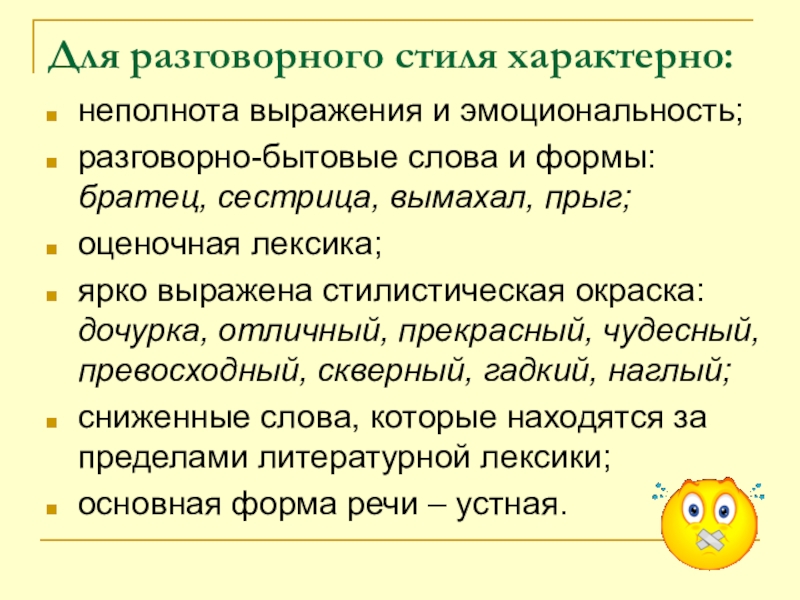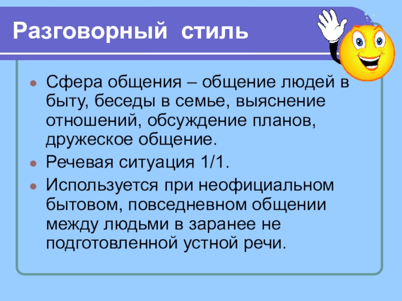 Используется при неофициальном бытовом, повседневном общении между людьми в заранее не подготовленной устной речи.