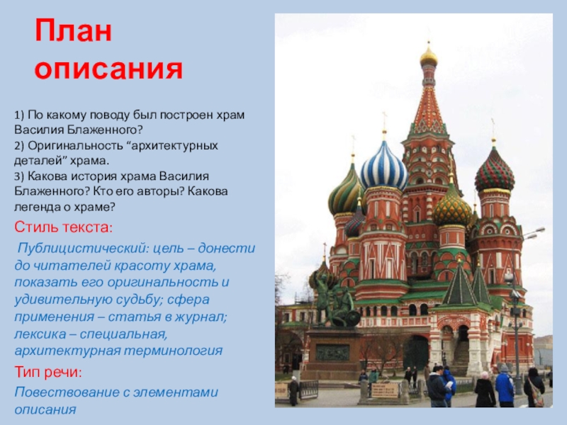 Публицистический: цель – донести до читателей красоту храма, показать его оригинальность и удивительную судьбу; сфера применения – статья в журнал; лексика – специальная, архитектурная терминология