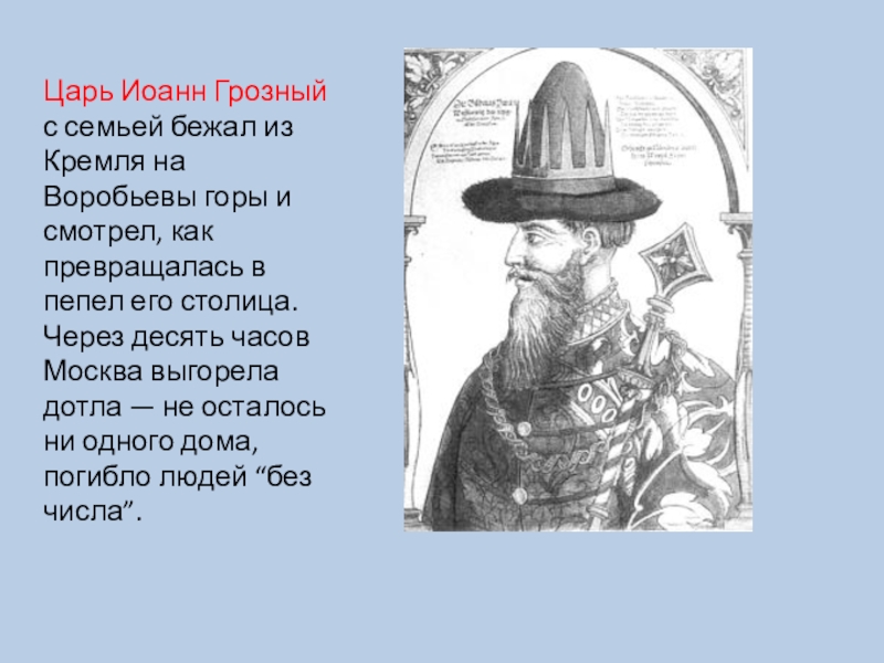 Слайд 9Царь Иоанн Грозный с семьей бежал из Кремля на Воробьевы горы