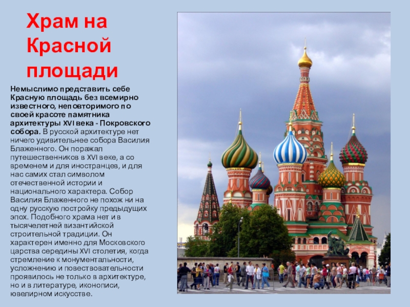 неповторимого по своей красоте памятника архитектуры XVI века - Покровского собора. В русской архитектуре нет ничего удивительнее собора Василия Блаженного. Он поражал путешественников в XVI веке, а со временем и для иностранцев, и для нас самих стал символом отечественной истории и национального характера. Собор Василия Блаженного не похож ни на одну русскую постройку предыдущих эпох. Подобного храма нет и в тысячелетней византийской строительной традиции. Он характерен именно для Московского царства середины XVI столетия, когда стремление к монументальности, усложнению и повествовательности проявилось не только в архитектуре, но и в литературе, иконописи, ювелирном искусстве.