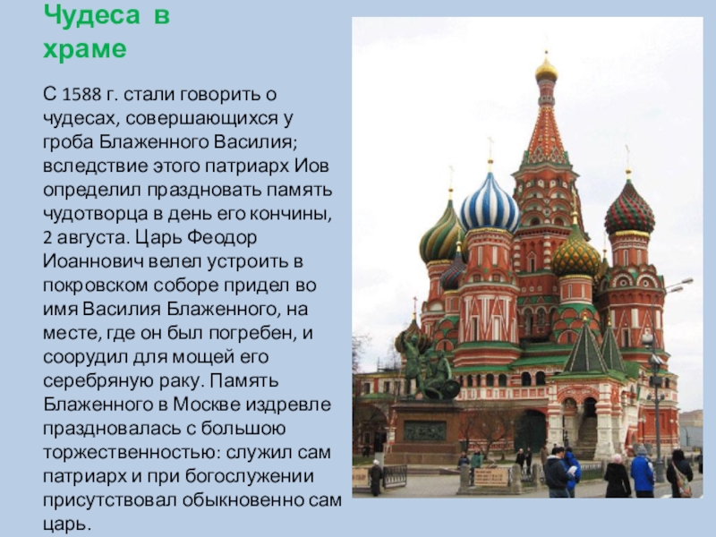 гроба Блаженного Василия; вследствие этого патриарх Иов определил праздновать память чудотворца в день его кончины, 2 августа. Царь Феодор Иоаннович велел устроить в покровском соборе придел во имя Василия Блаженного, на месте, где он был погребен, и соорудил для мощей его серебряную раку. Память Блаженного в Москве издревле праздновалась с большою торжественностью: служил сам патриарх и при богослужении присутствовал обыкновенно сам царь.