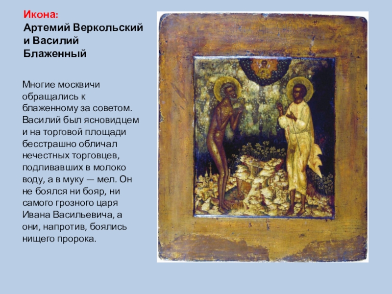 советом. Василий был ясновидцем и на торговой площади бесстрашно обличал нечестных торговцев, подливавших в молоко воду, а в муку — мел. Он не боялся ни бояр, ни самого грозного царя Ивана Васильевича, а они, напротив, боялись нищего пророка.
