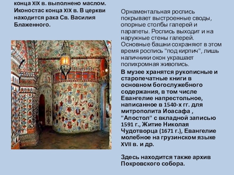 Слайд 14Настенное «иконное» письмо конца XIX в. выполнено маслом. Иконостас конца XIX
