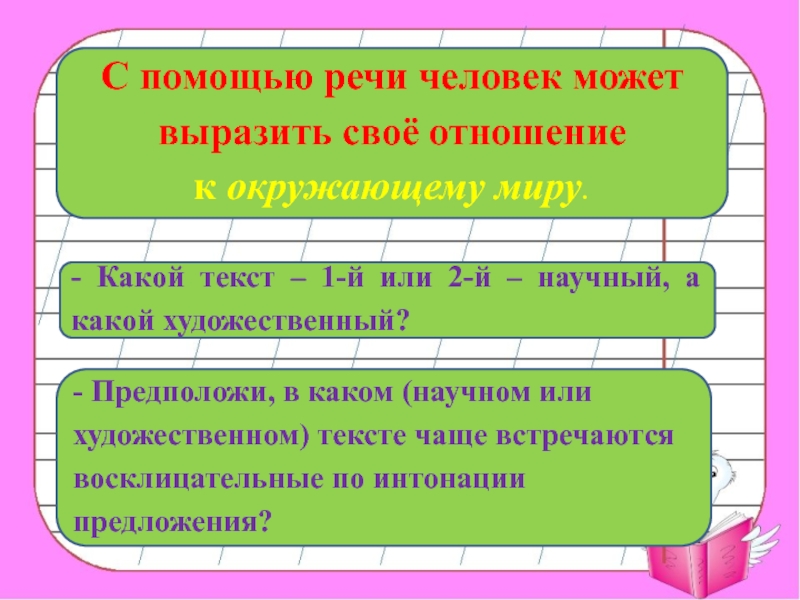 - Предположи, в каком (научном или художественном) тексте чаще встречаются восклицательные по интонации предложения?