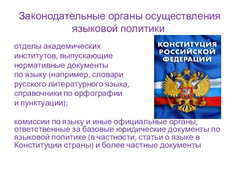 комиссии по языку и иные официальные органы, ответственные за базовые юридические документы по языковой политике (в частности, статьи о языке в Конституции страны) и более частные документы