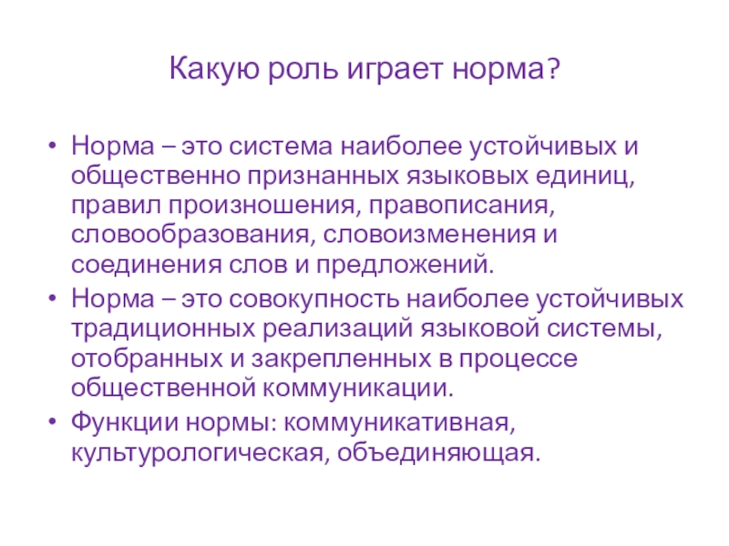 Функции нормы: коммуникативная, культурологическая, объединяющая.