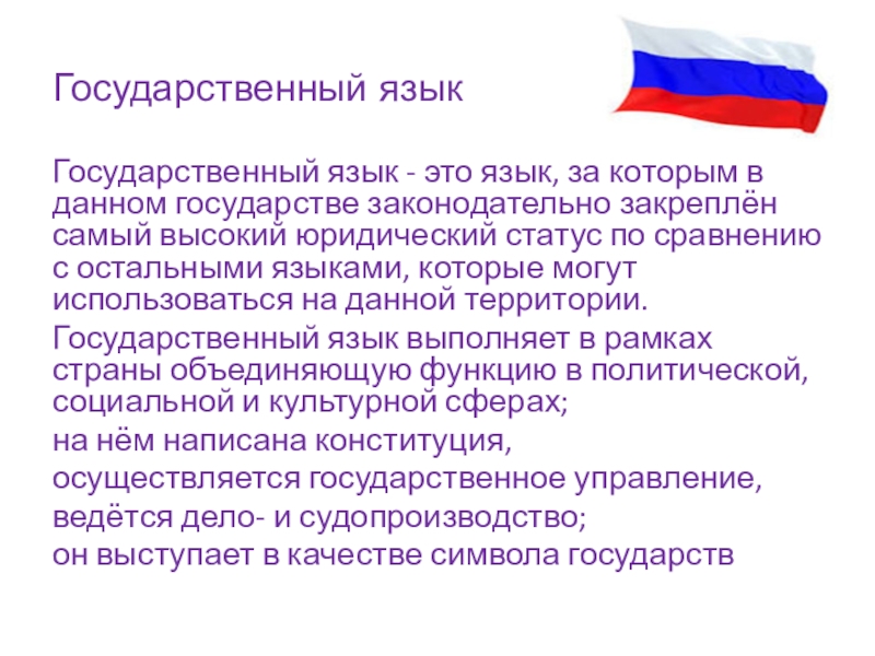 Государственный – значит официальный, утвержденный органами власти, обязательный для употребления, законодательно регламентирующий языковые отношения в обществе