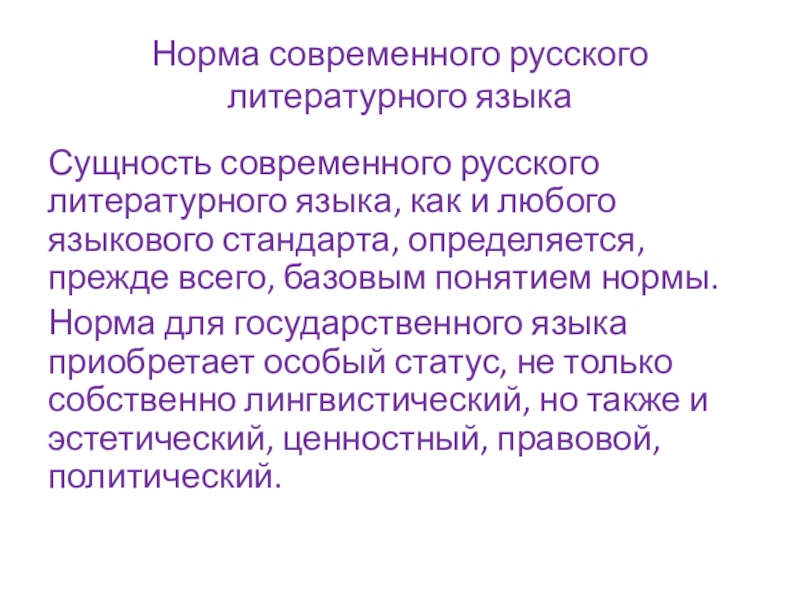 Норма для государственного языка приобретает особый статус, не только собственно лингвистический, но также и эстетический, ценностный, правовой, политический.
