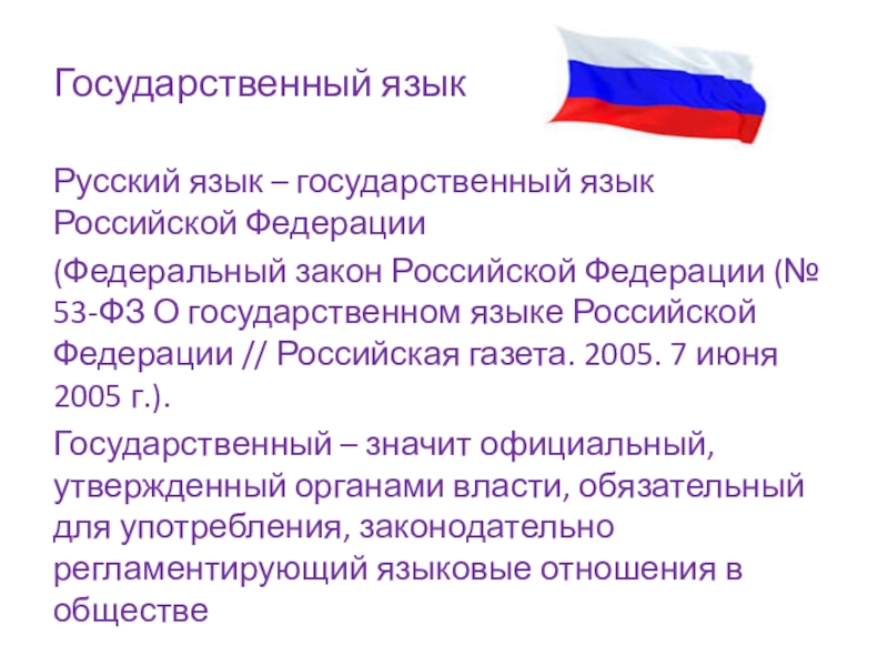 Федерации (№ 53-ФЗ О государственном языке Российской Федерации // Российская газета. 2005. 7 июня 2005 г.).