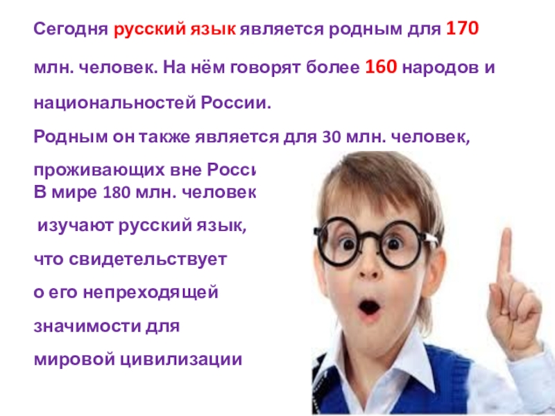 Сегодня русский язык является родным для 170 млн. человек. На нём говорят более 160 народов и национальностей России.
