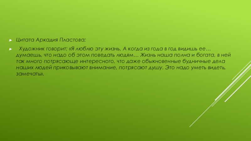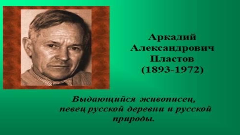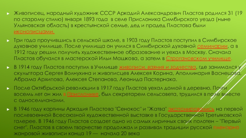 В 1946 году картины Аркадия Пластова "Сенокос" и "Жатва" экспонировались на первой послевоенной Всесоюзной художественной выставке в Государственной Третьяковской галерее. В 1946 году Пластов создает одно из самых лиричных своих полотен – "Первый снег". Пластов в своем творчестве продолжал и развивал традиции русской пленэрно жанровой живописи конца 19 — начала 20 века