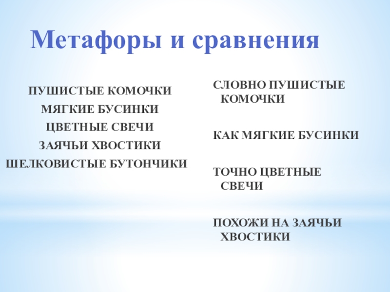 Метафоры и сравнения ПУШИСТЫЕ КОМОЧКИМЯГКИЕ БУСИНКИЦВЕТНЫЕ СВЕЧИЗАЯЧЬИ ХВОСТИКИШЕЛКОВИСТЫЕ БУТОНЧИКИСЛОВНО ПУШИСТЫЕ КОМОЧКИКАК МЯГКИЕ БУСИНКИТОЧНО ЦВЕТНЫЕ СВЕЧИПОХОЖИ НА ЗАЯЧЬИ