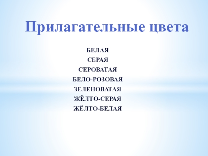 БЕЛАЯСЕРАЯСЕРОВАТАЯБЕЛО-РОЗОВАЯЗЕЛЕНОВАТАЯЖЁЛТО-СЕРАЯЖЁЛТО-БЕЛАЯПрилагательные цвета