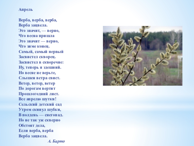 значит — верно, Что зиме конец. Самый, самый первый Засвистел скворец. Засвистел в скворечне: Ну, теперь я здешний. Но весне не верьте, Слышен ветра свист. Ветер, ветер, ветер По дорогам вертит Прошлогодний лист. Все апрелю шутки! Сельский детский сад Утром скинул шубки, В полдень — снегопад. Но не так уж скверно Обстоят дела, Если верба, верба Верба зацвела. А. Барто