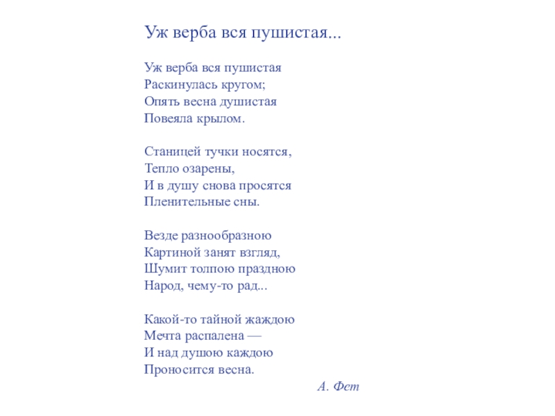 Уж верба вся пушистая...   Уж верба вся пушистая Раскинулась кругом; Опять весна душистая Повеяла