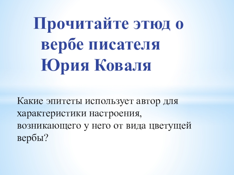 Прочитайте этюд о вербе писателя Юрия Коваля Какие эпитеты использует автор для характеристики настроения, возникающего