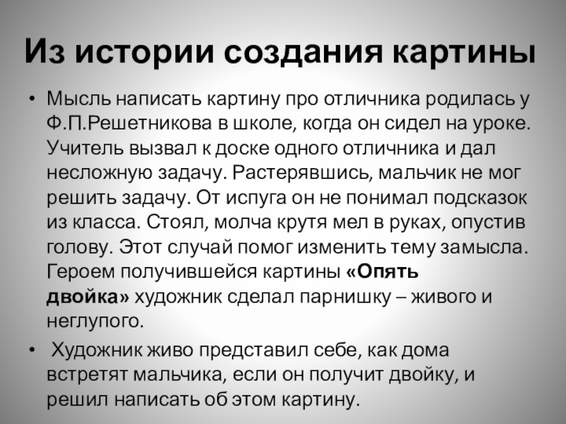 в школе, когда он сидел на уроке. Учитель вызвал к доске одного отличника и дал несложную задачу. Растерявшись, мальчик не мог решить задачу. От испуга он не понимал подсказок из класса. Стоял, молча крутя мел в руках, опустив голову. Этот случай помог изменить тему замысла. Героем получившейся картины «Опять двойка» художник сделал парнишку – живого и неглупого.