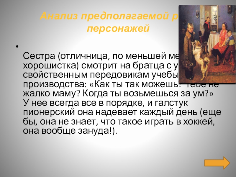 на братца с упреком, свойственным передовикам учебы и производства: «Как ты так можешь? Тебе не жалко маму? Когда ты возьмешься за ум?» У нее всегда все в порядке, и галстук пионерский она надевает каждый день (еще бы, она не знает, что такое играть в хоккей, она вообще зануда!).