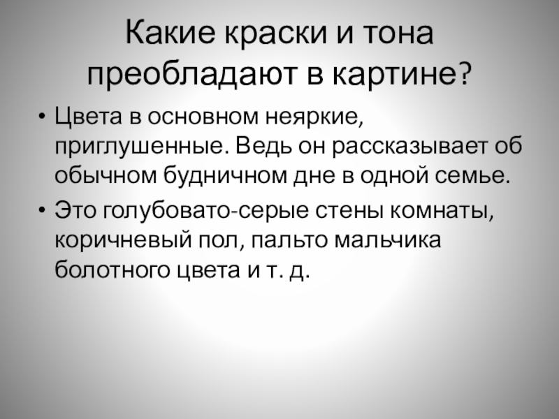 Слайд 17Какие краски и тона преобладают в картине?