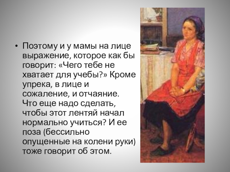 «Чего тебе не хватает для учебы?» Кроме упрека, в лице и сожаление, и отчаяние. Что еще надо сделать, чтобы этот лентяй начал нормально учиться? И ее поза (бессильно опущенные на колени руки) тоже говорит об этом.