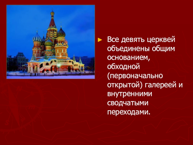 Слайд 10Все девять церквей объединены общим основанием, обходной (первоначально открытой) галереей и
