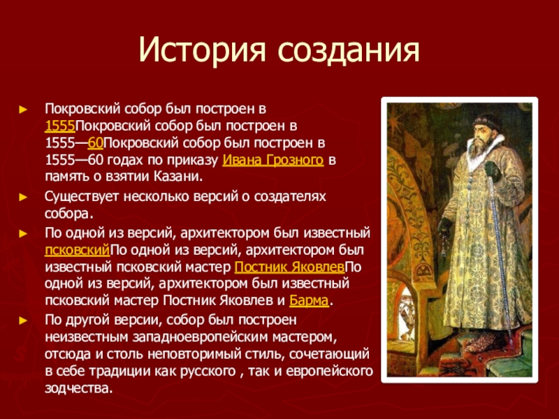 По одной из версий, архитектором был известный псковскийПо одной из версий, архитектором был известный псковский мастер Постник ЯковлевПо одной из версий, архитектором был известный псковский мастер Постник Яковлев и Барма.