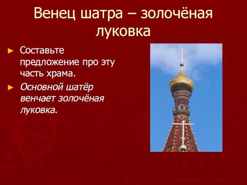 Слайд 14Венец шатра – золочёная луковка
