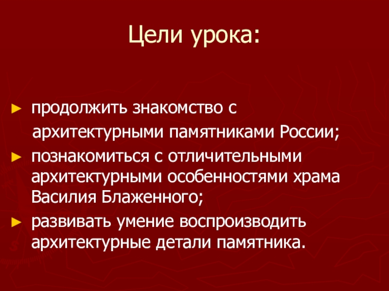 развивать умение воспроизводить архитектурные детали памятника.