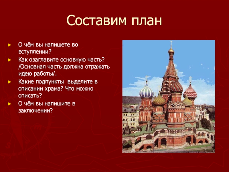 Какие подпункты выделите в описании храма? Что можно описать?