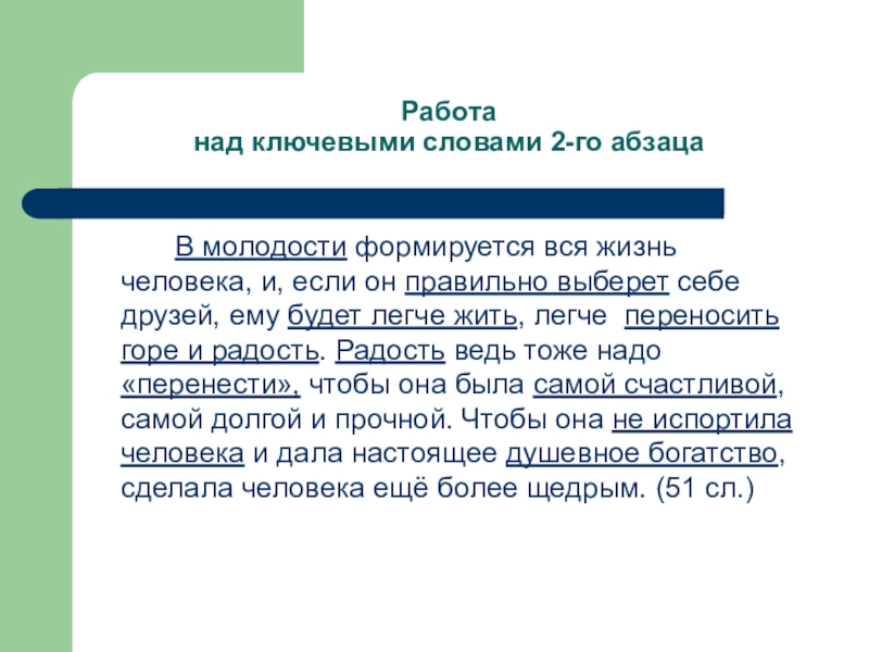 и, если он правильно выберет себе друзей, ему будет легче жить, легче переносить горе и радость. Радость ведь тоже надо «перенести», чтобы она была самой счастливой, самой долгой и прочной. Чтобы она не испортила человека и дала настоящее душевное богатство, сделала человека ещё более щедрым. (51 сл.)
