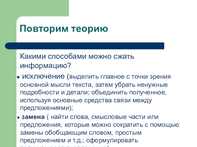 замена ( найти слова, смысловые части или предложения, которые можно сократить с помощью замены обобщающим словом, простым предложением и т.д.; сформулировать получившееся предложение).