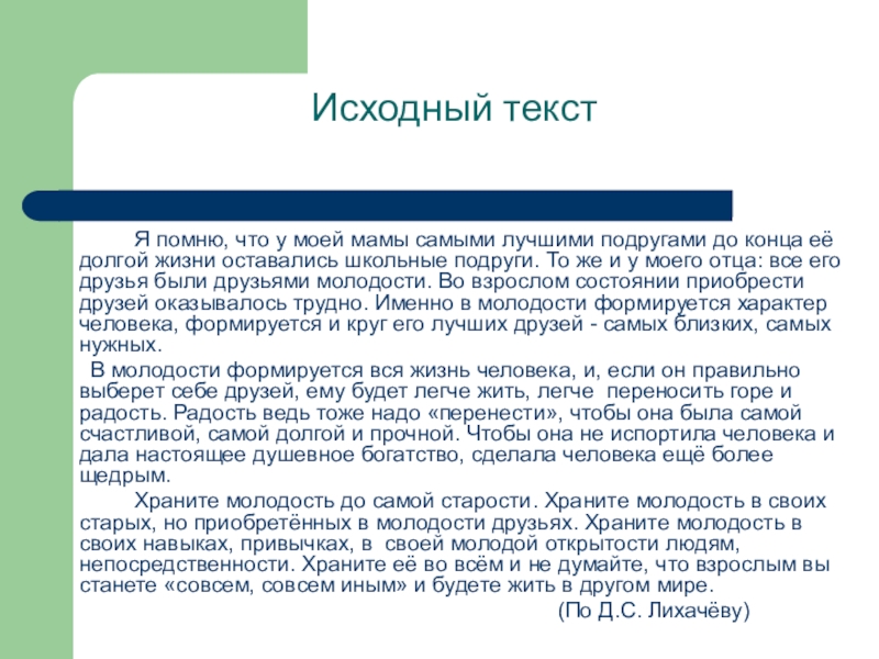молодость в своих старых, но приобретённых в молодости друзьях. Храните молодость в своих навыках, привычках, в своей молодой открытости людям, непосредственности. Храните её во всём и не думайте, что взрослым вы станете «совсем, совсем иным» и будете жить в другом мире. (47 сл.)