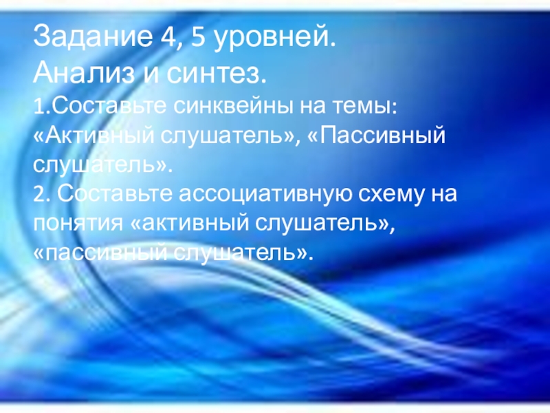 Слайд 8 Задание 4, 5 уровней. Анализ и синтез. 1.Составьте синквейны на темы: «Активный