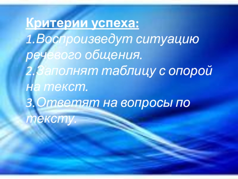Слайд 3 Критерии успеха: 1.Воспроизведут ситуацию речевого общения. 2.Заполнят таблицу с опорой на текст. 3.Ответят на