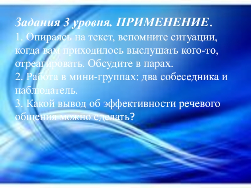 Слайд 7 Задания 3 уровня. ПРИМЕНЕНИЕ. 1. Опираясь на текст, вспомните ситуации, когда вам