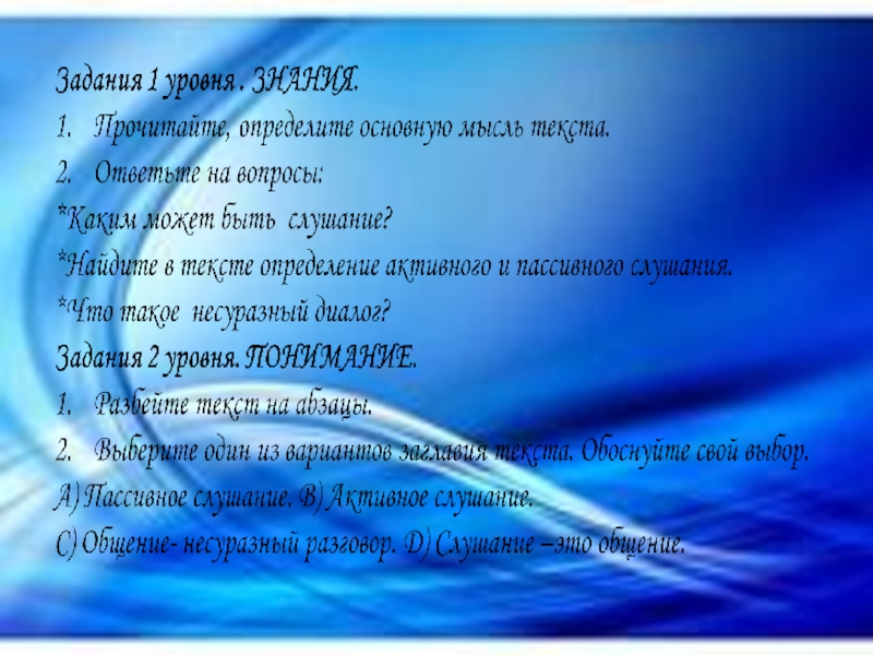Работа с текстом. Слушание может быть разным. Один вид –это молчаливое слушание, без вмешательства в речь собеседника