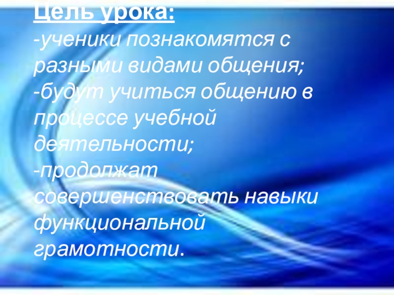 Цель урока: -ученики познакомятся с разными видами общения; -будут учиться общению в процессе учебной деятельности; -продолжат совершенствовать навыки функциональной грамотности.