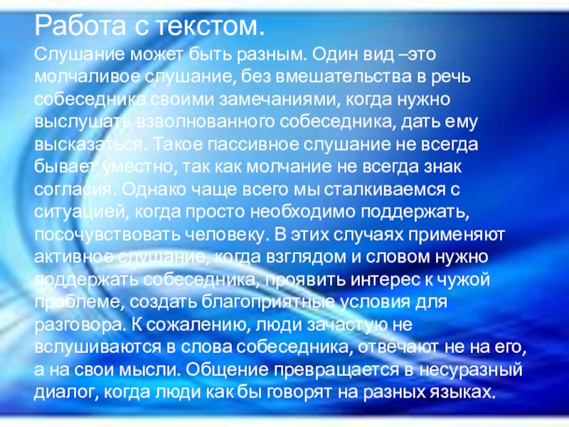 Слайд 5Работа с текстом. Слушание может быть разным. Один вид –это молчаливое слушание,