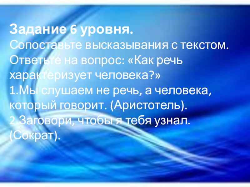 Слайд 9 Задание 6 уровня. Сопоставьте высказывания с текстом. Ответьте на вопрос: «Как речь