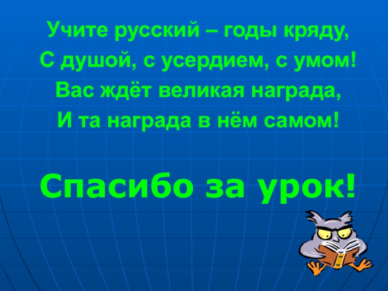 Учите русский – годы кряду,С душой, с усердием, с умом!Вас ждёт великая награда,И та награда в нём