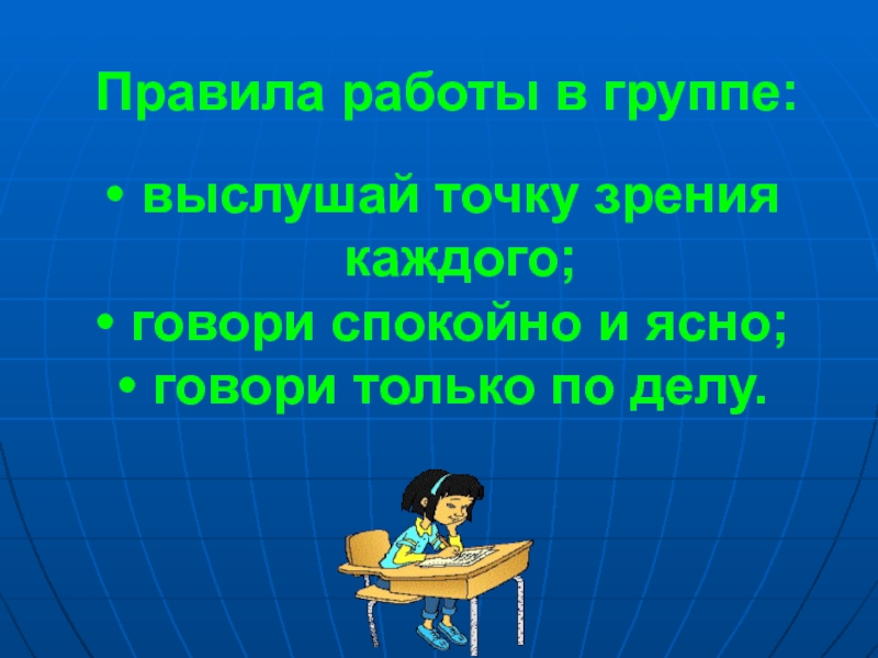 Правила работы в группе:  выслушай точку зрения каждого;говори спокойно и ясно;говори только по делу.