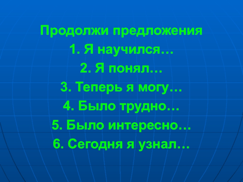 Продолжи предложения1. Я научился…2. Я понял…3. Теперь я могу…4. Было трудно…5. Было интересно…6. Сегодня я узнал…