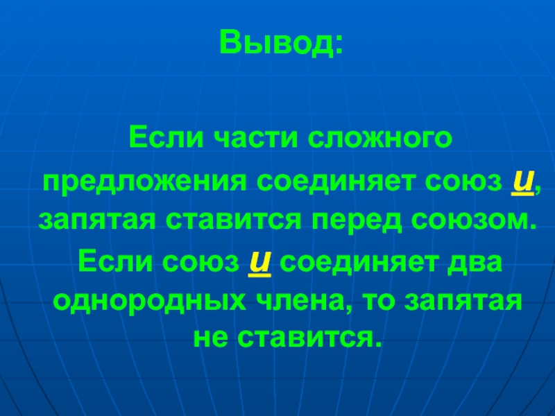 Вывод:   Если части сложного предложения соединяет союз и, запятая ставится перед союзом.  Если союз