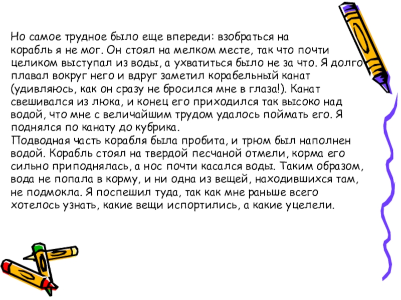 Но самое трудное было еще впереди: взобраться накорабль я не мог. Он стоял на мелком месте, так
