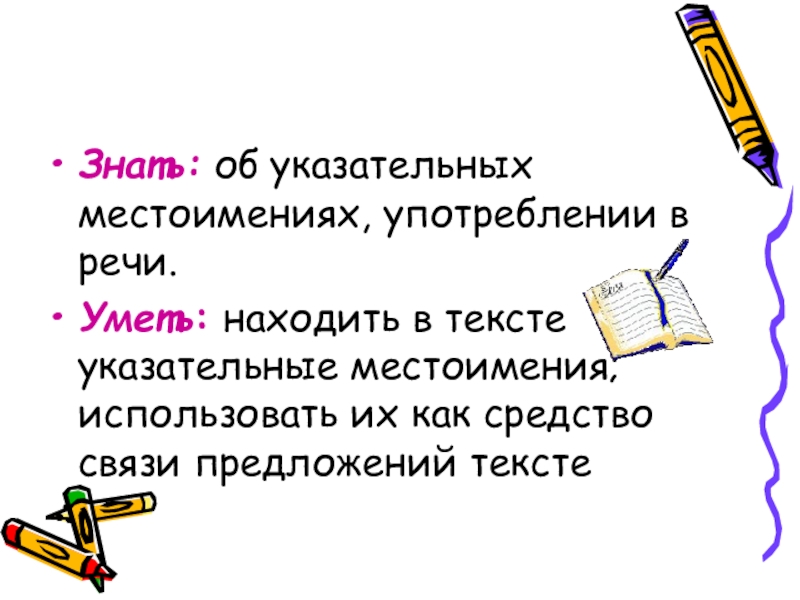 Знать: об указательных местоимениях, употреблении в речи.Уметь: находить в тексте указательные местоимения; использовать их как средство связи