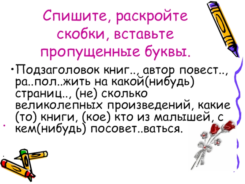 Спишите, раскройте скобки, вставьте пропущенные буквы.. .Подзаголовок книг.., автор повест.., ра..пол..жить на какой(нибудь) страниц.., (не) сколько великолепных